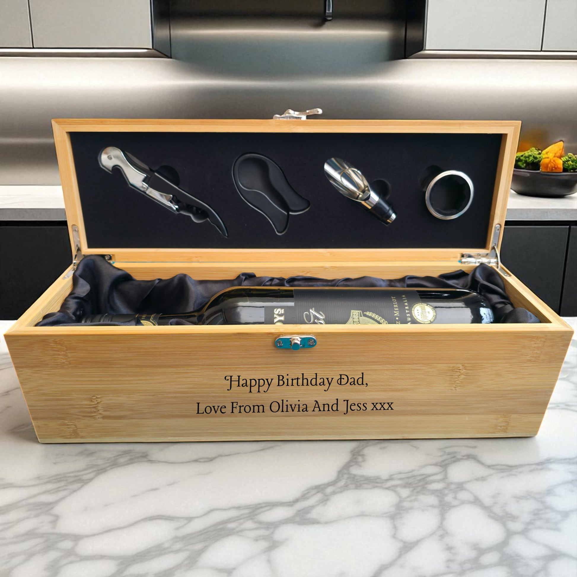 Make their special day unforgettable with this luxurious Personalised Bamboo Wine Box Gift Set. Whether it is a Father's Day treat for Dad, a Christmas surprise for Nana, or a thoughtful birthday gift for Auntie, this set adds a personal touch that shows how much you care.